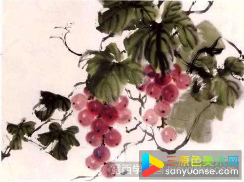 以藤黄调花青作绿葡萄,或以花青调胭脂作紫葡萄,也可以直接以墨色写墨葡萄。果穗要注意错落有臻,上密下疏,浓淡相宜,有藏有露。切忌左右对称,平均发布。