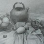 《陶罐与水果临摹》之一作品构图基本稳定,主体突出,画面完整,有统一的色彩关系。但主体物的处理过于软,笔触与色彩节奏弱,边沿线的环境色处理...