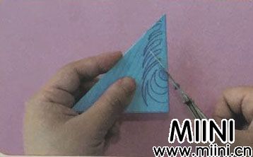 1.按http://www.miini.cn/zhiyi/1647.html折四瓣花的方法折好彩纸,再画出孔雀羽毛的轮廓。